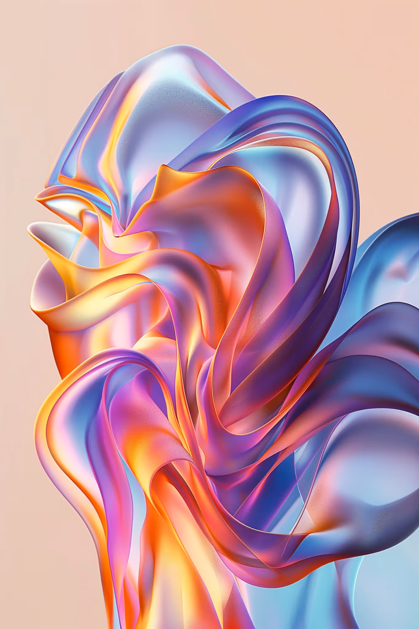 Set against a minimalist, softly gradient light peach backdrop, the intricate, glossy shapes take center stage. Their polished finish implies a three-dimensional aspect, making them resemble objects fashioned from a gleaming, liquid-like substance. This piece might conjure various interpretations, from themes of harmony and interconnectivity to a sense of digital or avant-garde aesthetics, thanks to its silken texture and flawless color transitions.