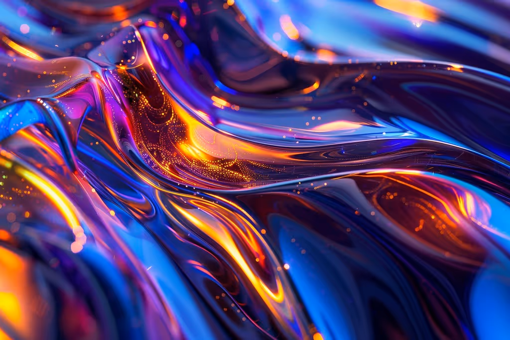 The image shows flowing shapes in iridescent hues, from deep blues and purples to vibrant pinks and oranges, creating an ethereal effect.